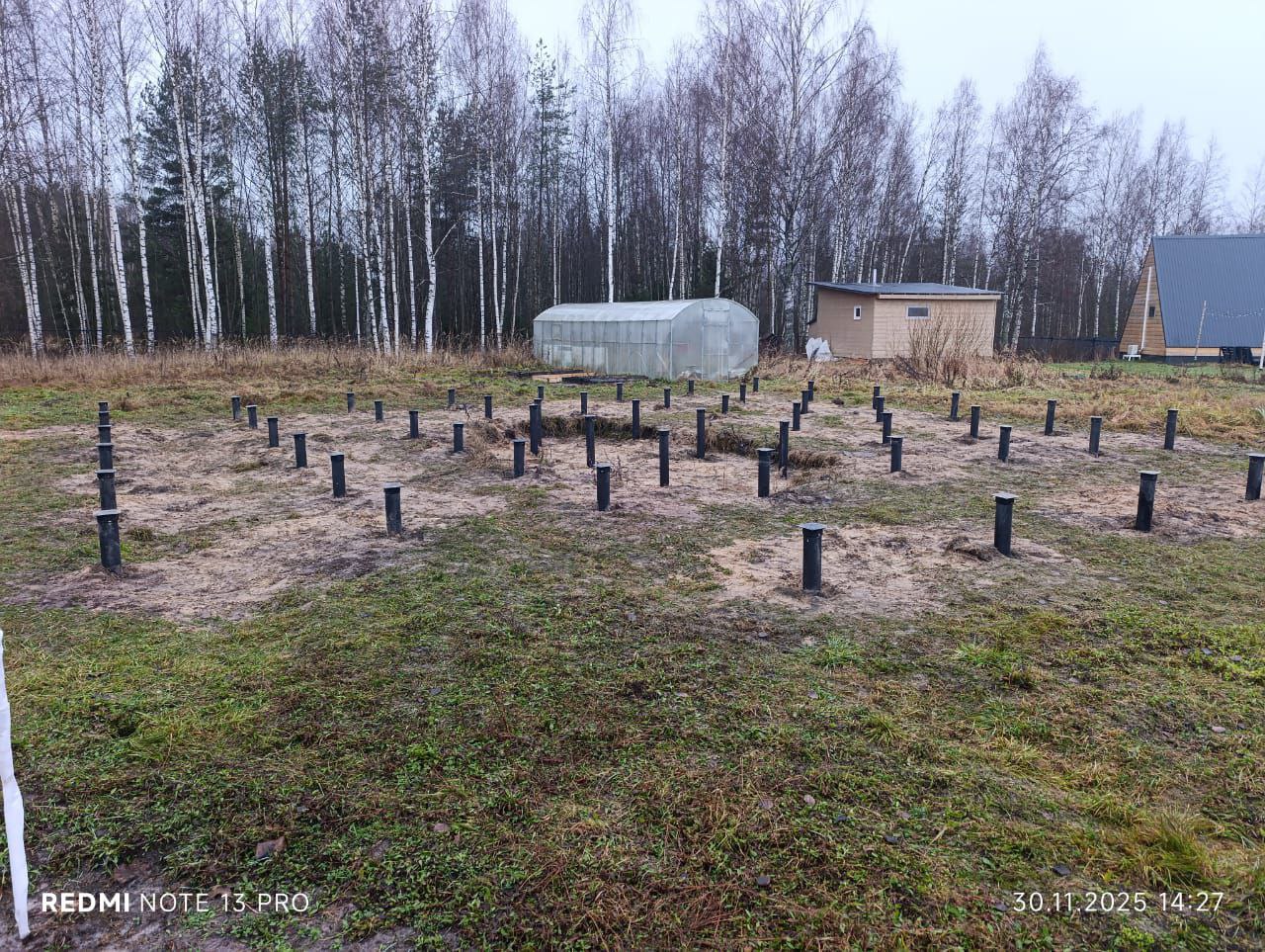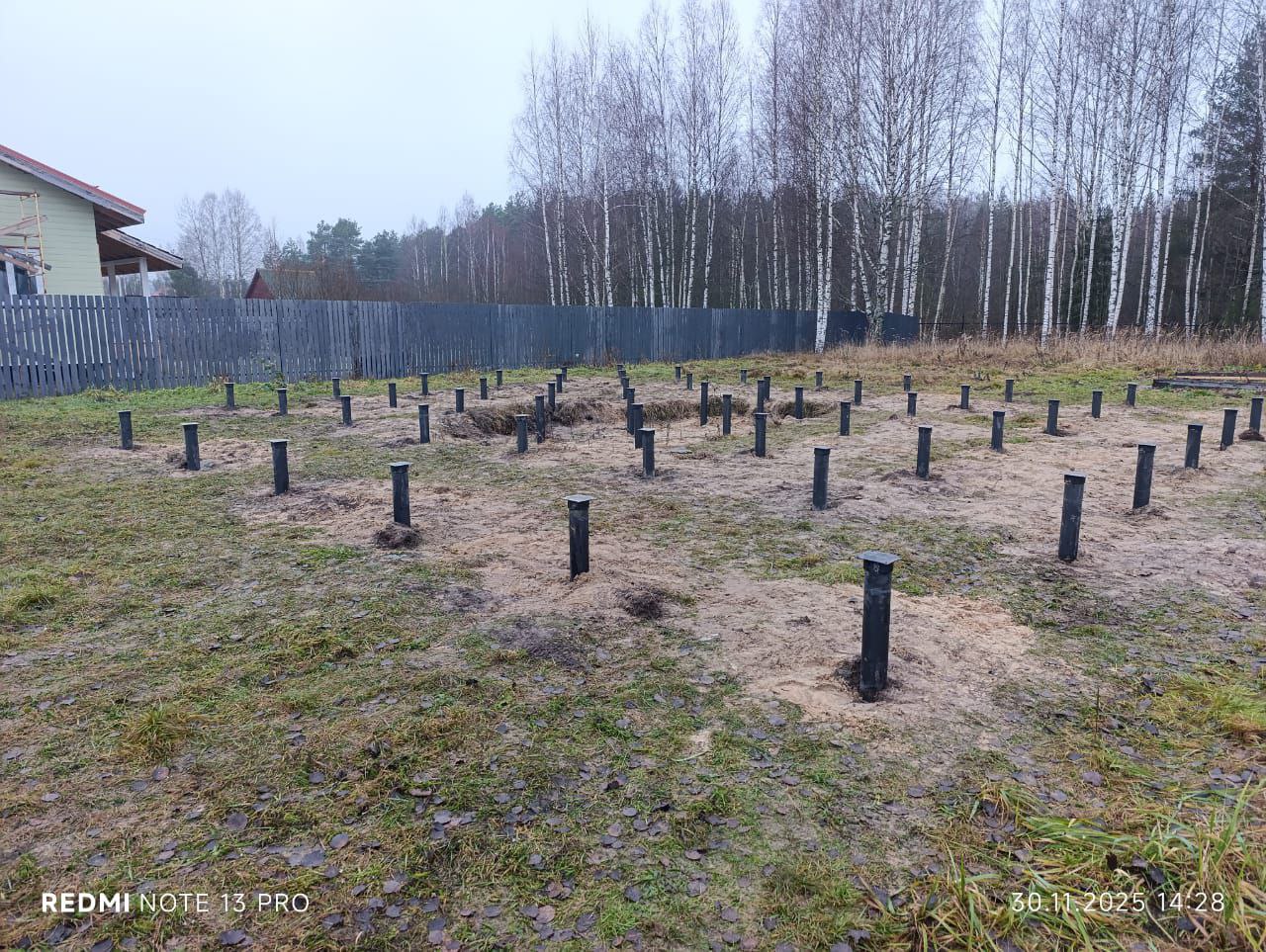 • Выравнивание: Все сваи были обрезаны до единого горизонтального уровня. Этот этап необходим для создания идеально ровной плоскости для дальнейшего строительства дома.