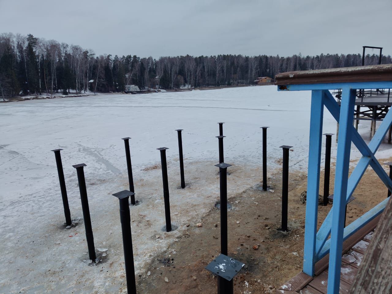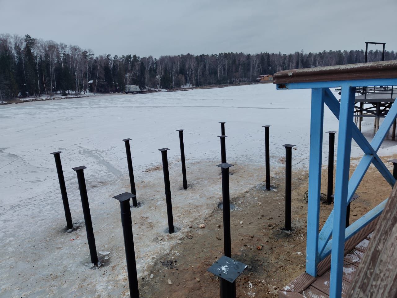 Выбор времени года для проведения работ был неслучайным. Зима является наиболее благоприятным периодом для возведения подобных сооружений на воде. Благодаря крепкому ледяному покрову наши специалисты получили устойчивую площадку для работы, что позволило избежать использования дорогостоящих понтонов или специализированной плавучей техники. Работа со льда дает возможность максимально точно позиционировать каждую опору и контролировать вертикаль при закручивании, обеспечивая идеальную геометрию будущего строения.
